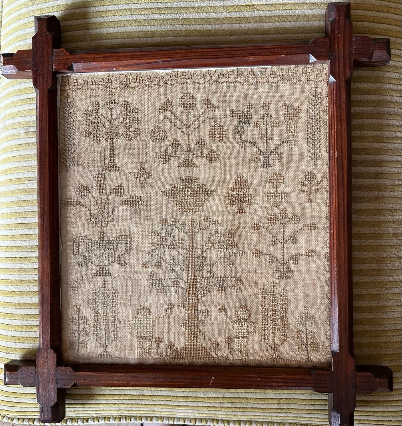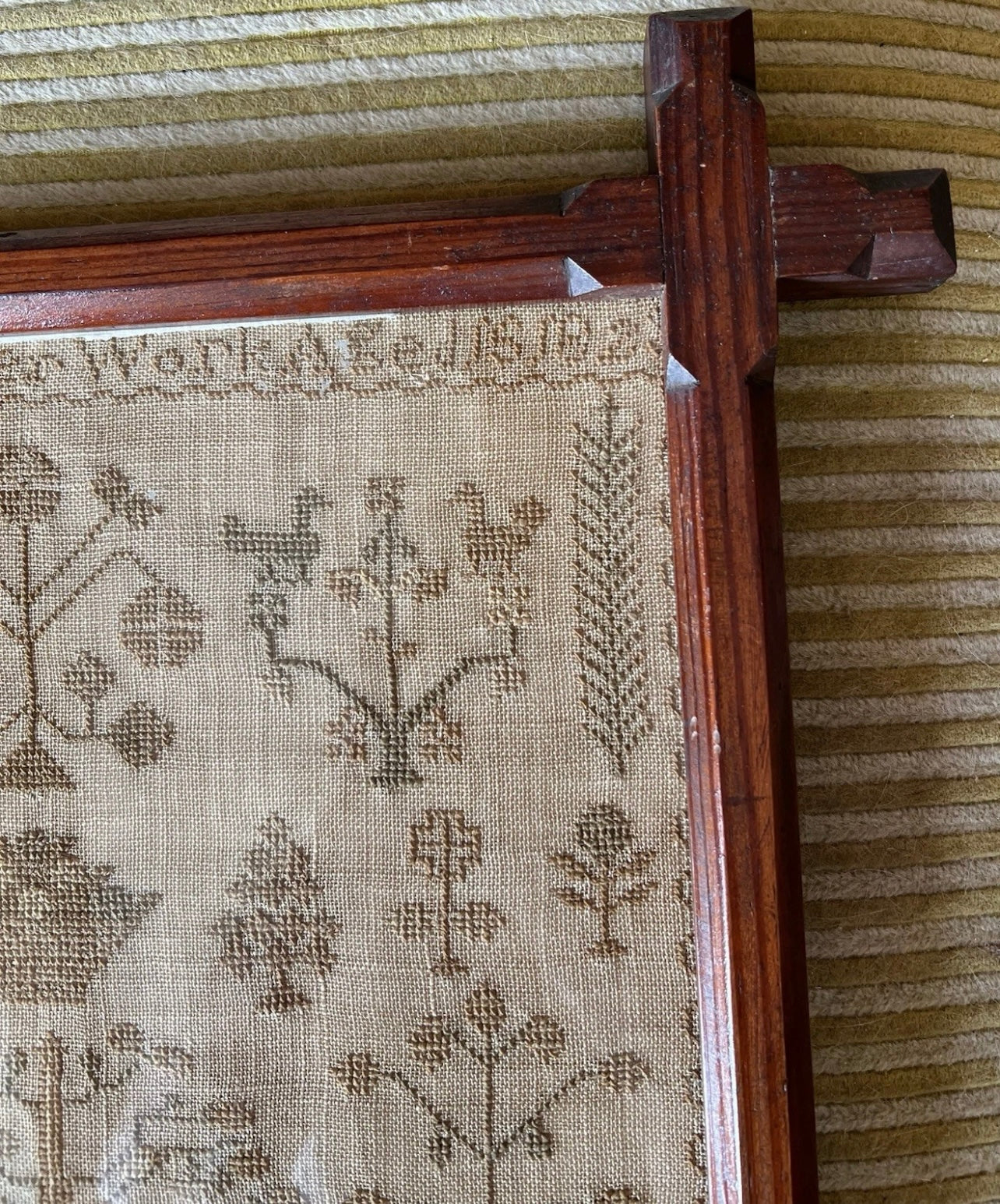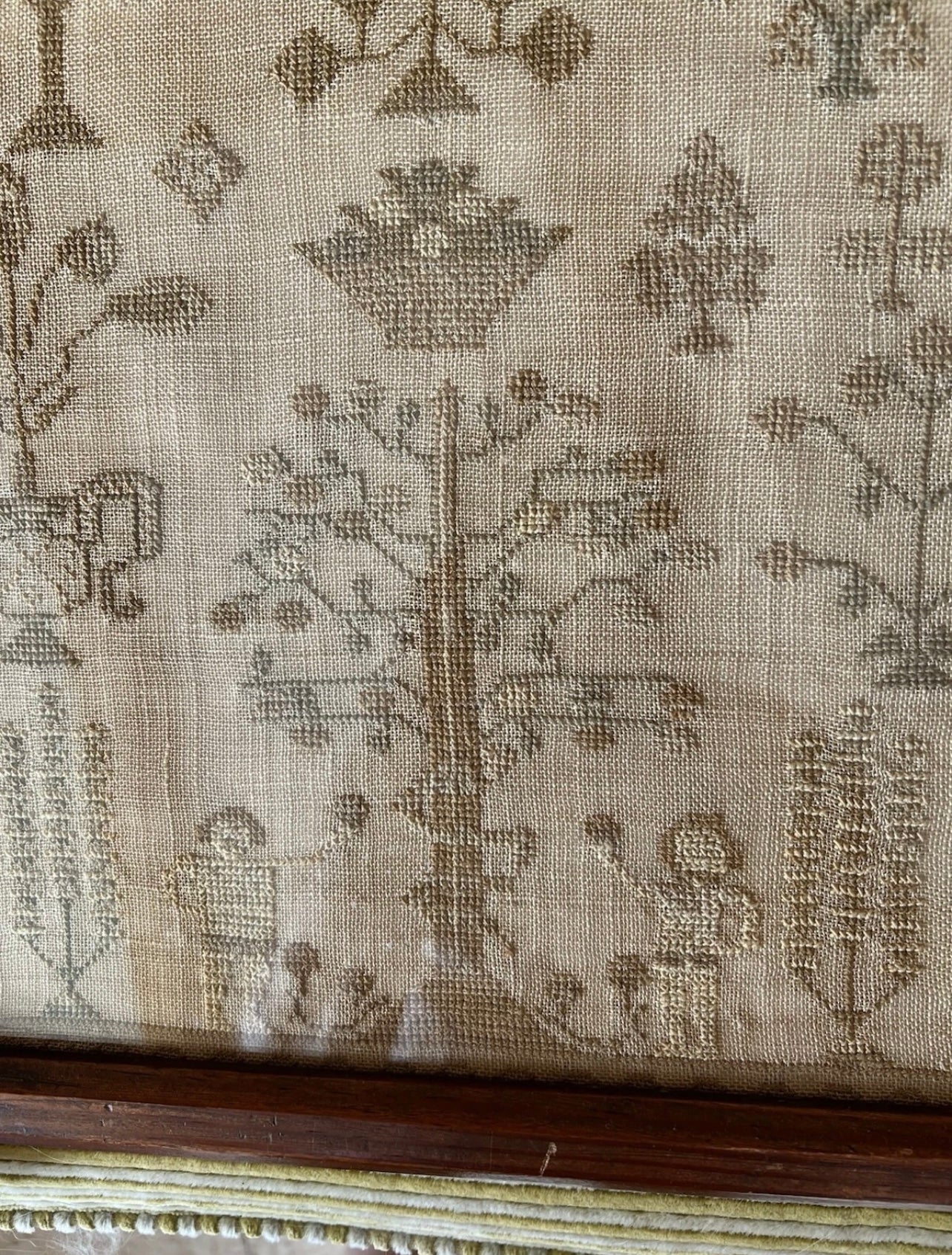 Central motif Adam & Eve surrounded by flora and birds in a parson’s frame. Measures 11.25” x 12.25” sight, 13 x 13.5 central frame. Has not been reproduced.