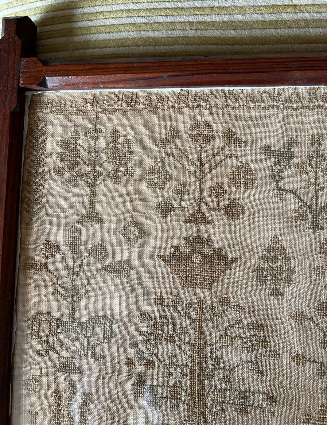 The Antique English Sampler featuring Hannah Oldham's age at 15 in 1823 is a unique piece with a somewhat faded multicolor design commensurate with its age. This sampler reflects the intricate craftsmanship and attention to detail typical of the time period. Perfect for collectors of vintage and antique pieces, this sampler offers a glimpse into the past and showcases the artistry of needlework in 19th century England.