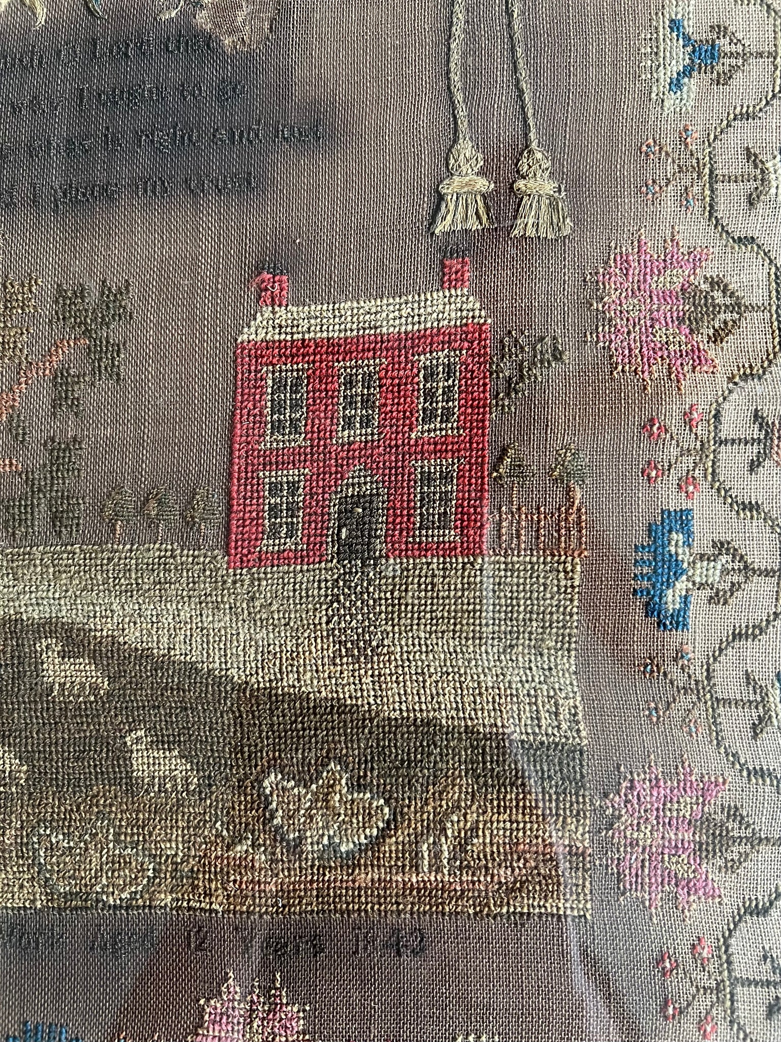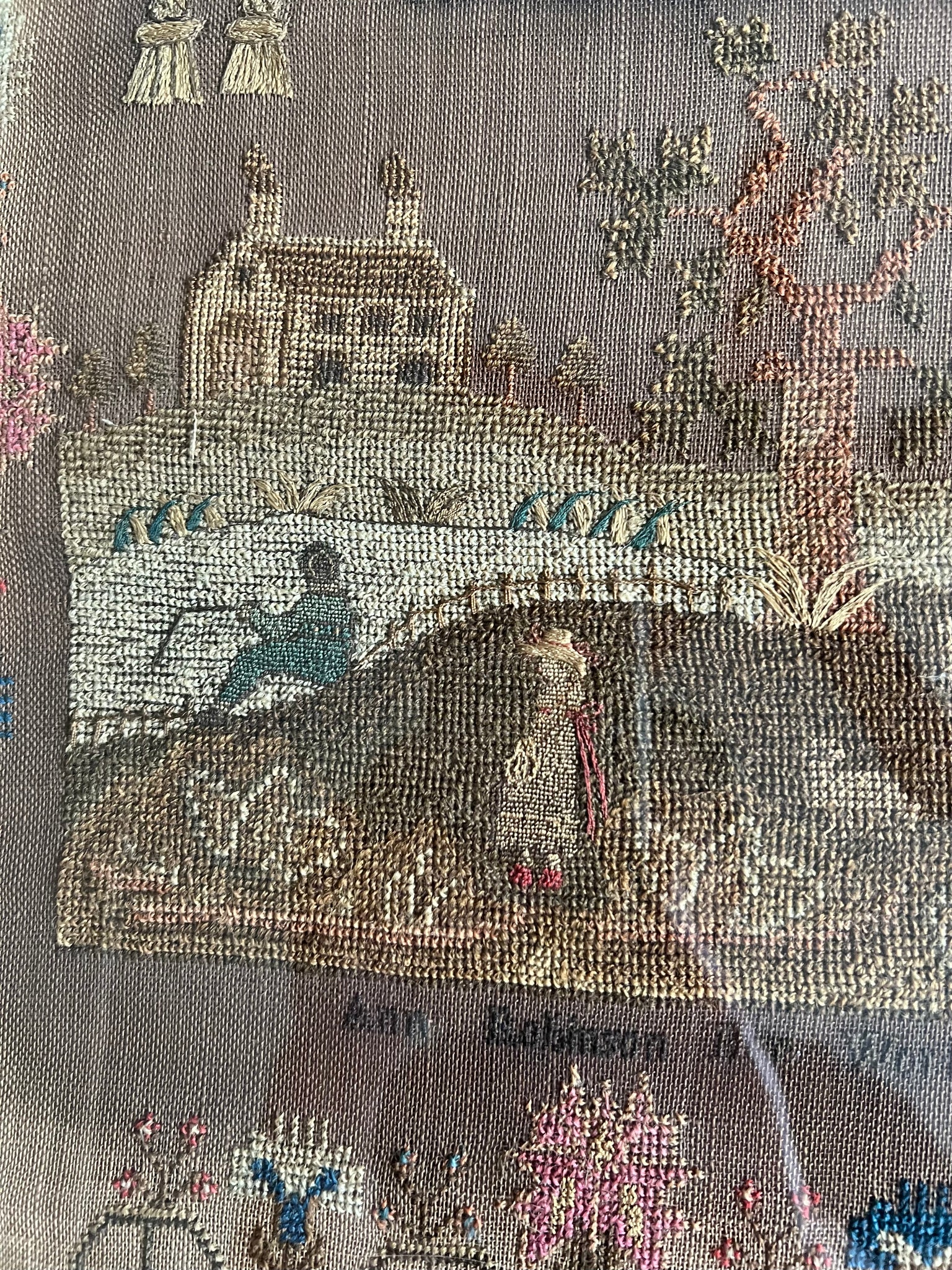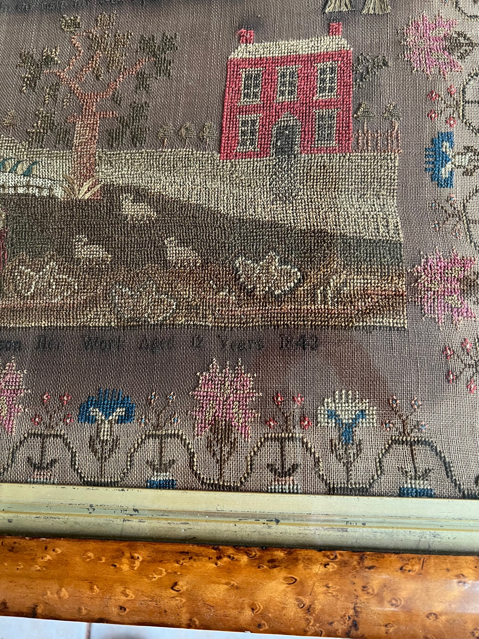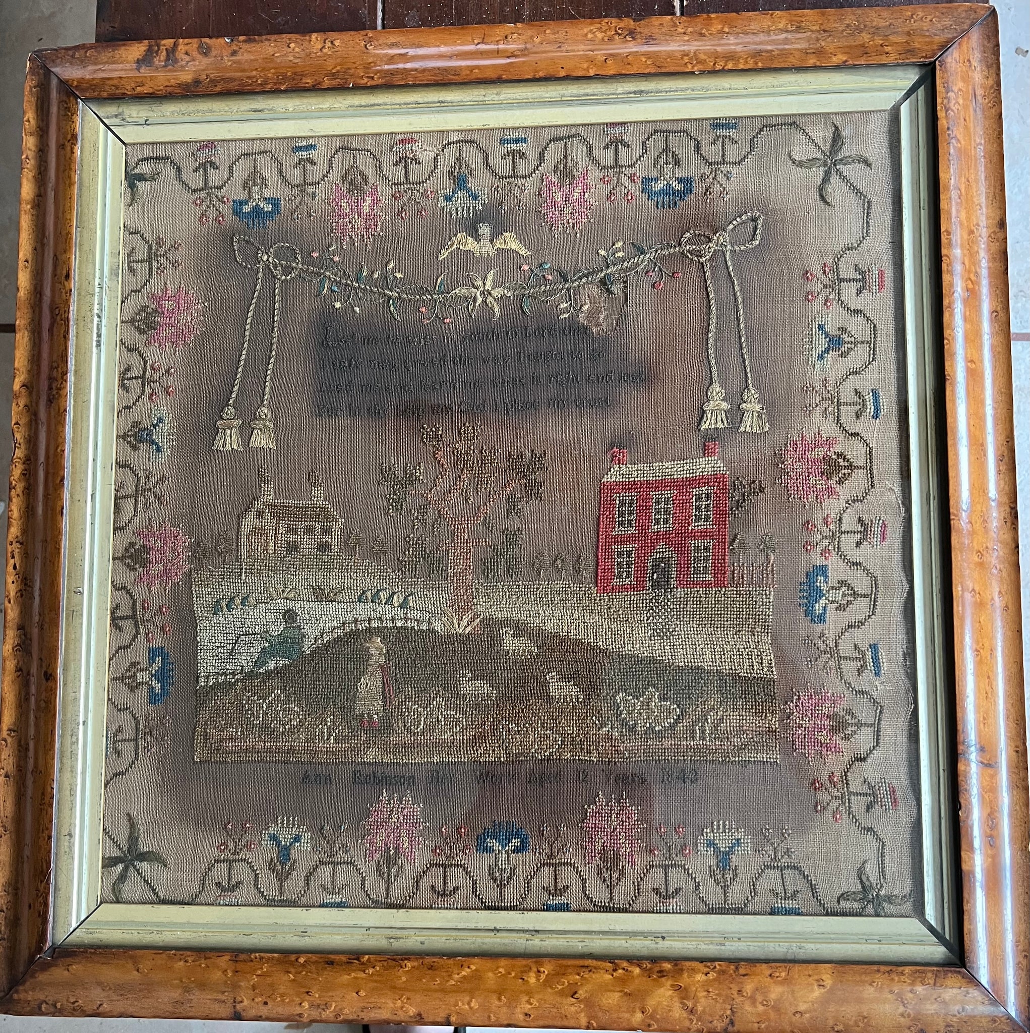 The antique English needlework sampler by Ann Robinson, dating back to 1843, features intricate and detailed stitching in a variety of multicolor threads. This framed piece is a beautiful example of mid 19th century English handwork and craftsmanship, showcasing the skill and artistry of the time period. Whether displayed as a decorative piece in a home or as part of a historical collection, this sampler is a unique and authentic glimpse into the past.