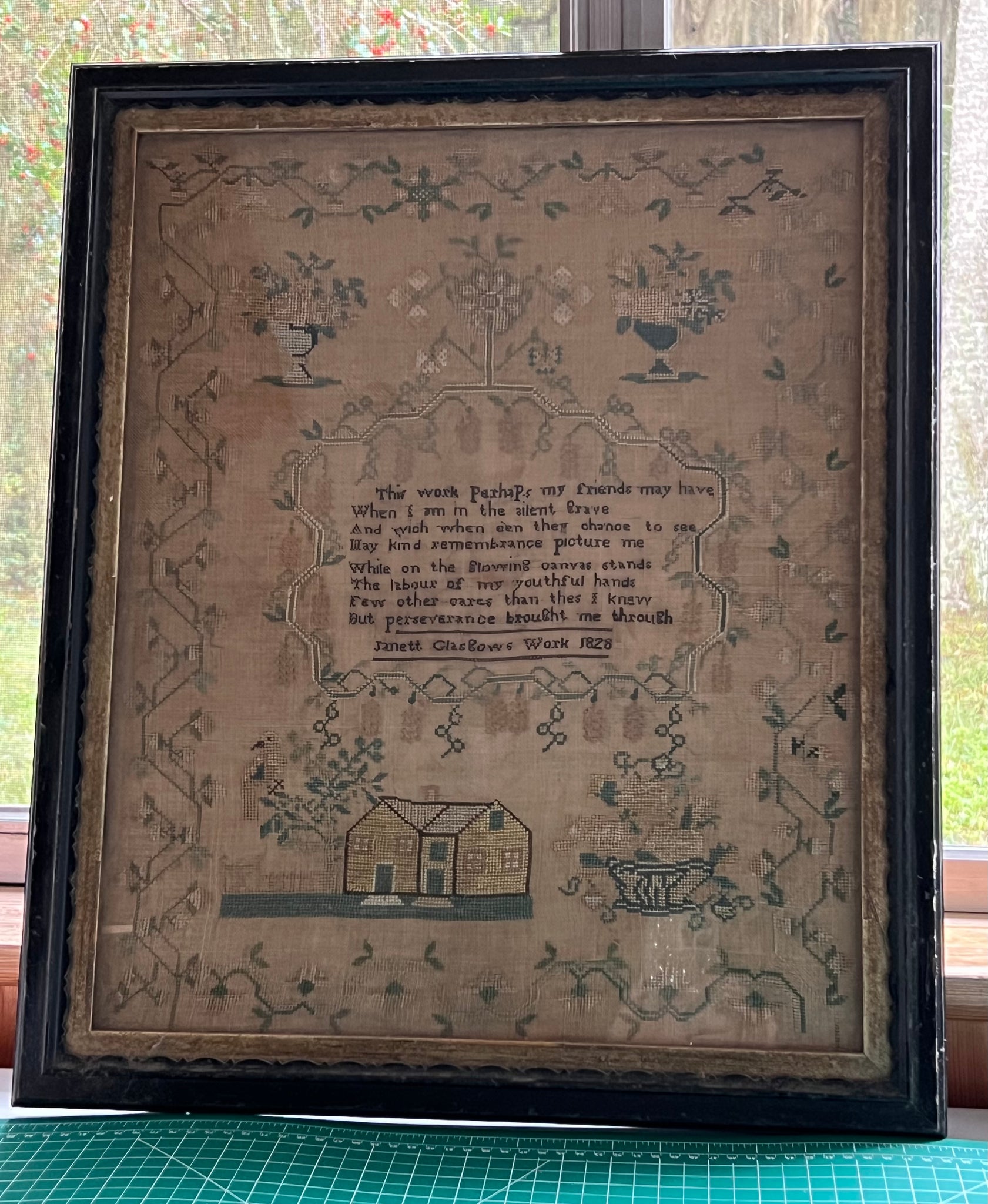 | The Antique English Needlework Sampler by Janett Glasgow from 1828 is a beautiful piece of intricate handwork featuring a variety of multicolor threads. This vintage sampler falls within the time period of the early mid 19th century showcasing traditional English needlework techniques. Perfect for collectors or enthusiasts of antique textiles, this sampler offers a glimpse into the craftsmanship and style of the past. Measures 16.5” x 21” sight, 20.5” x 24” framed. Queen and over one and two cross stitch. Has not been reproduced. |