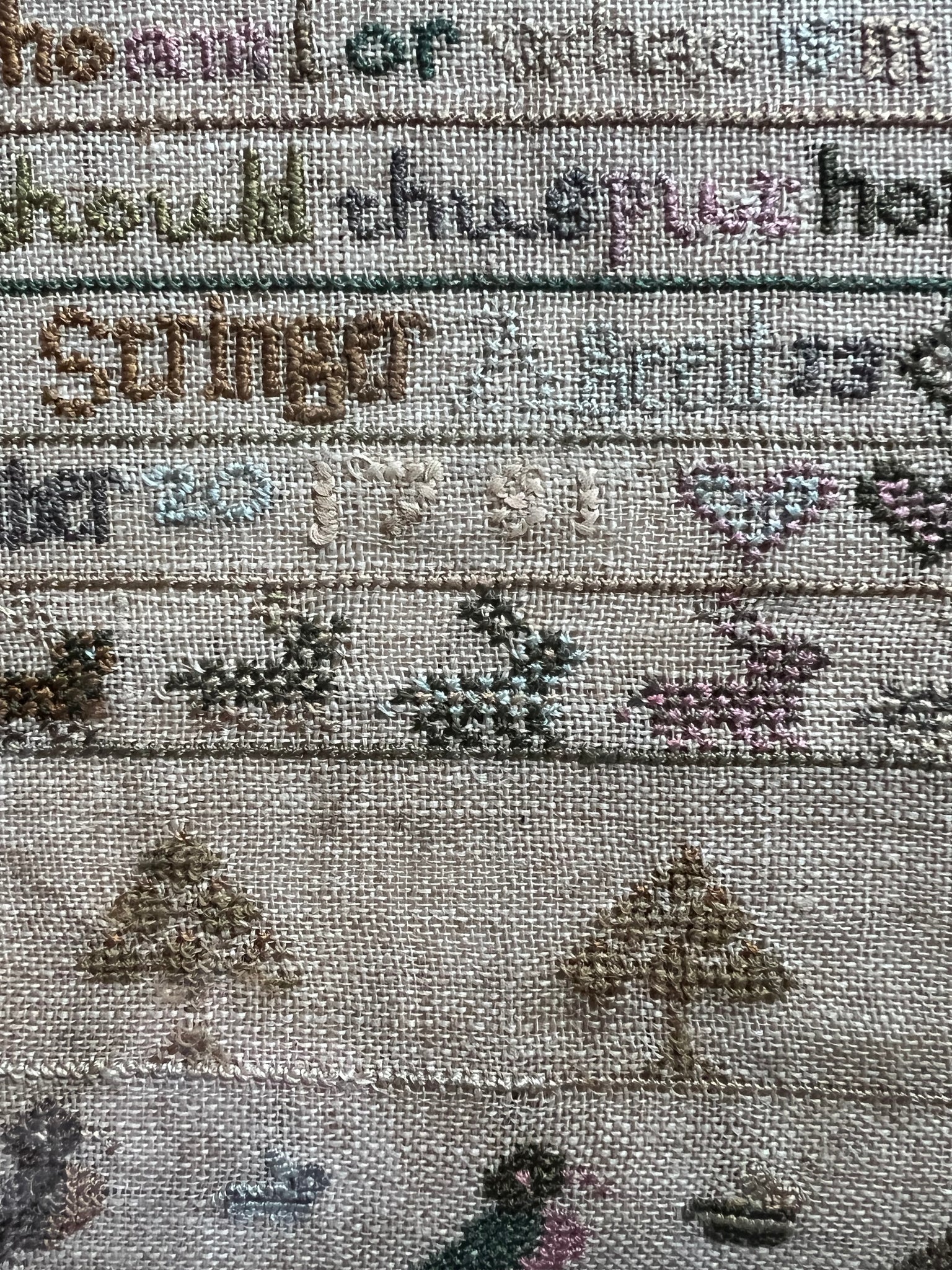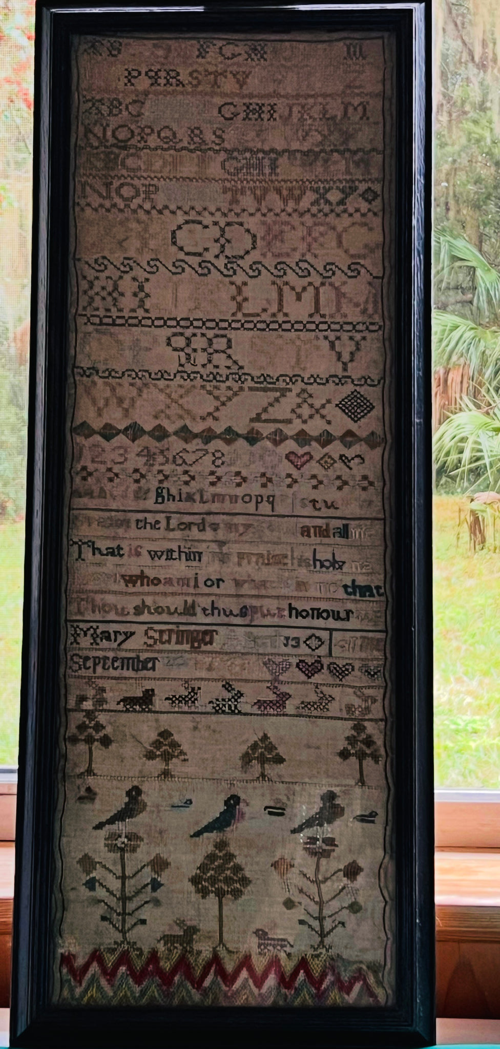 | The Antique English Needlework Sampler by Mary Stringer, dating back to September 20, 1781, is a beautifully crafted piece of history featuring intricate designs in vibrant multicolor threads. This intricate piece of 18th century craftsmanship showcases the exquisite skill and attention to detail characteristic of English needlework from that time period, making it a valuable and unique collectible for enthusiasts and collectors alike. Measures 8.5” x 25” sight, 10.5” x 27” framed. Has not been reproduced. Purchased from Madelena’s Antiques. Eyelet, satin, flame, cross stitch. |
