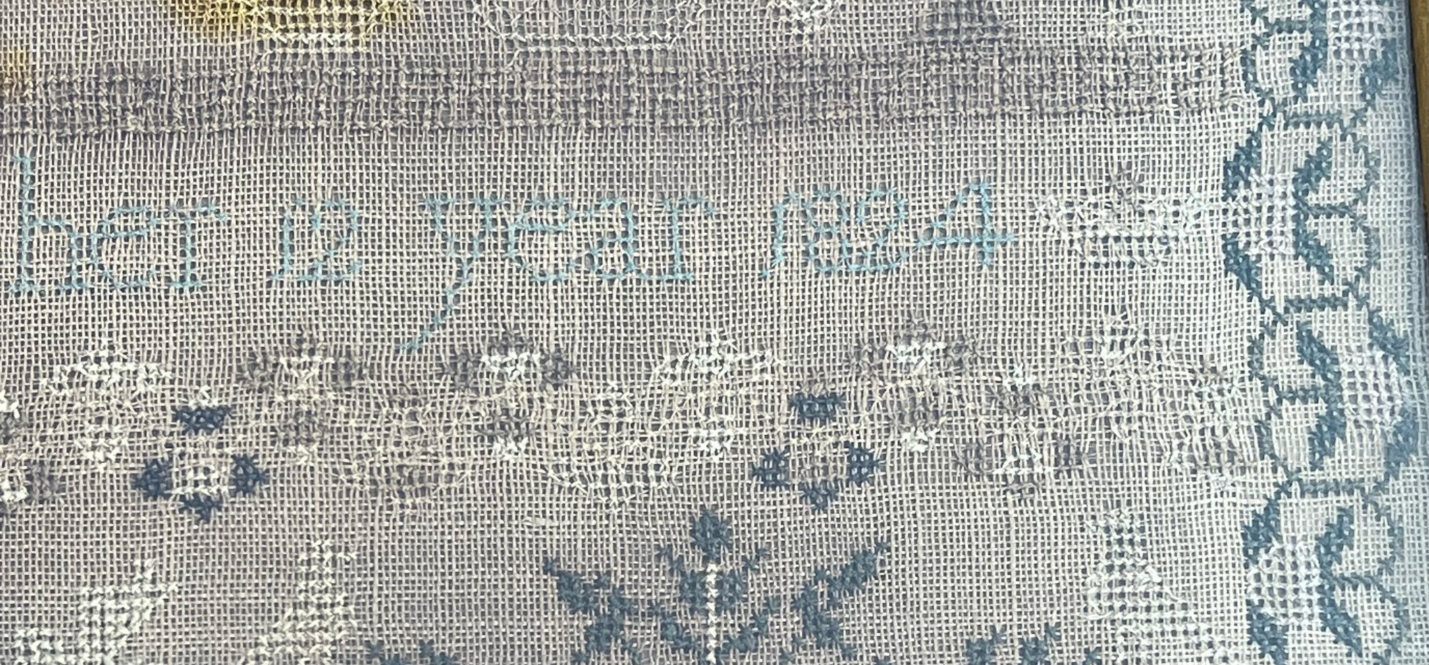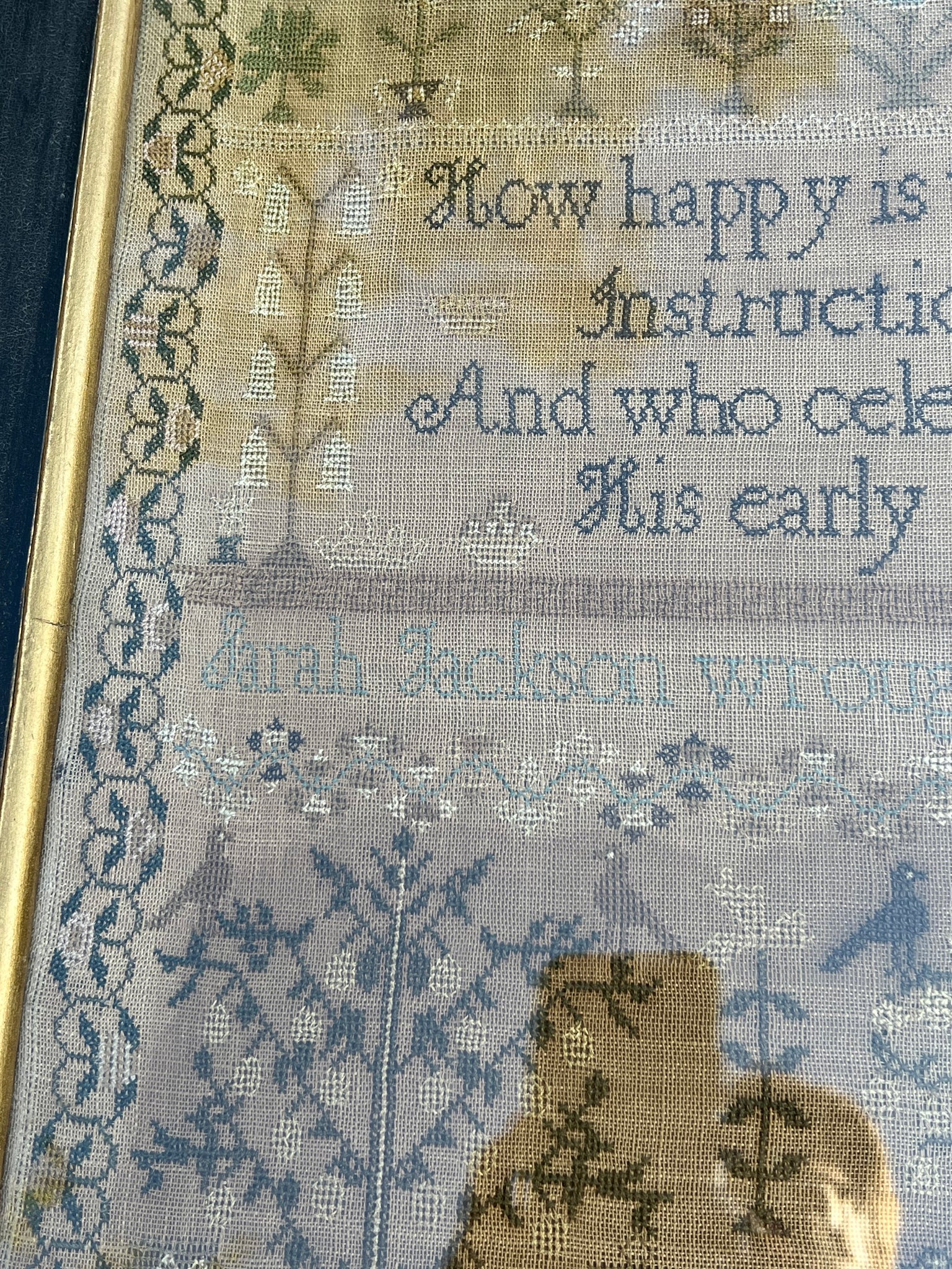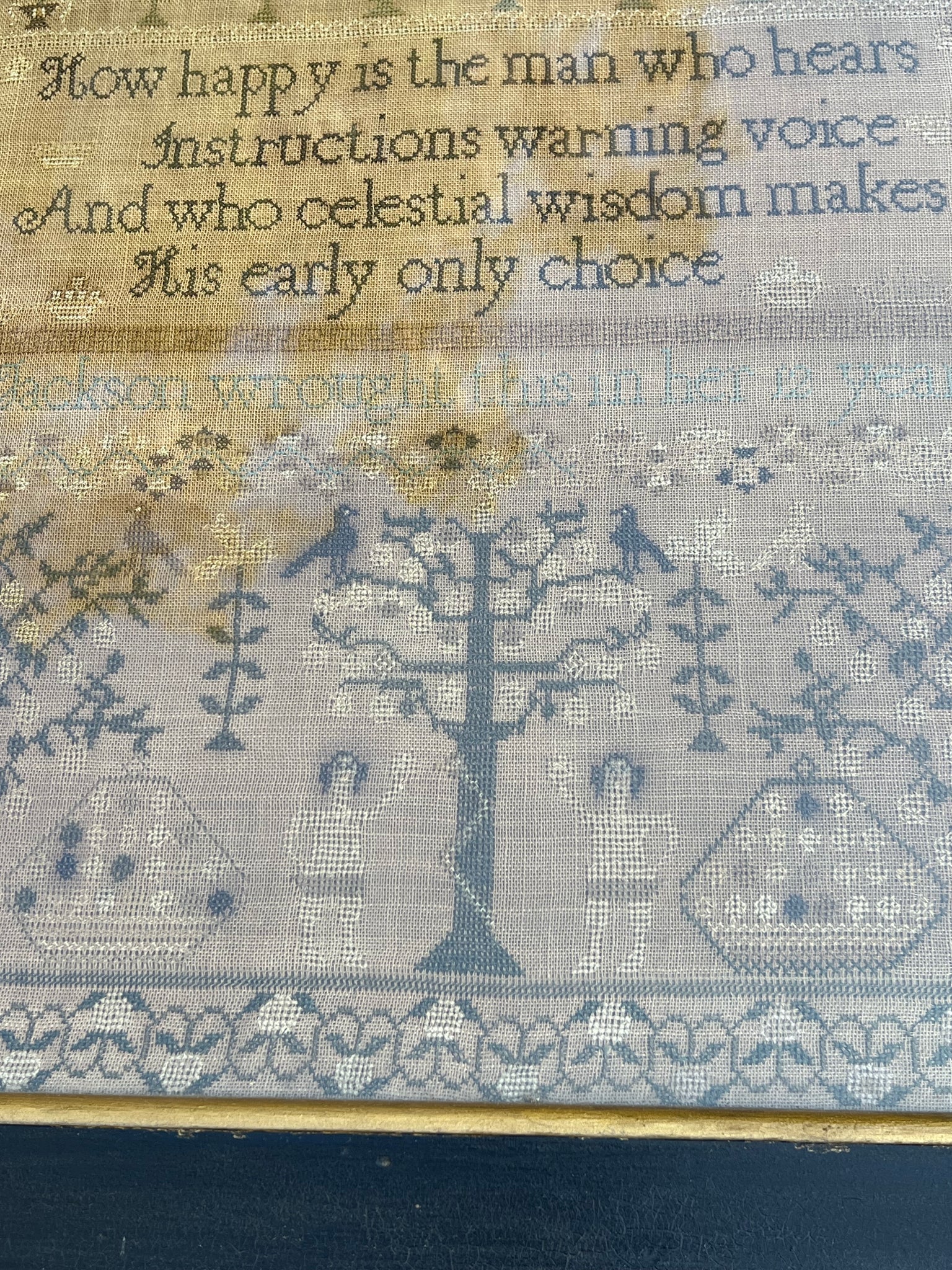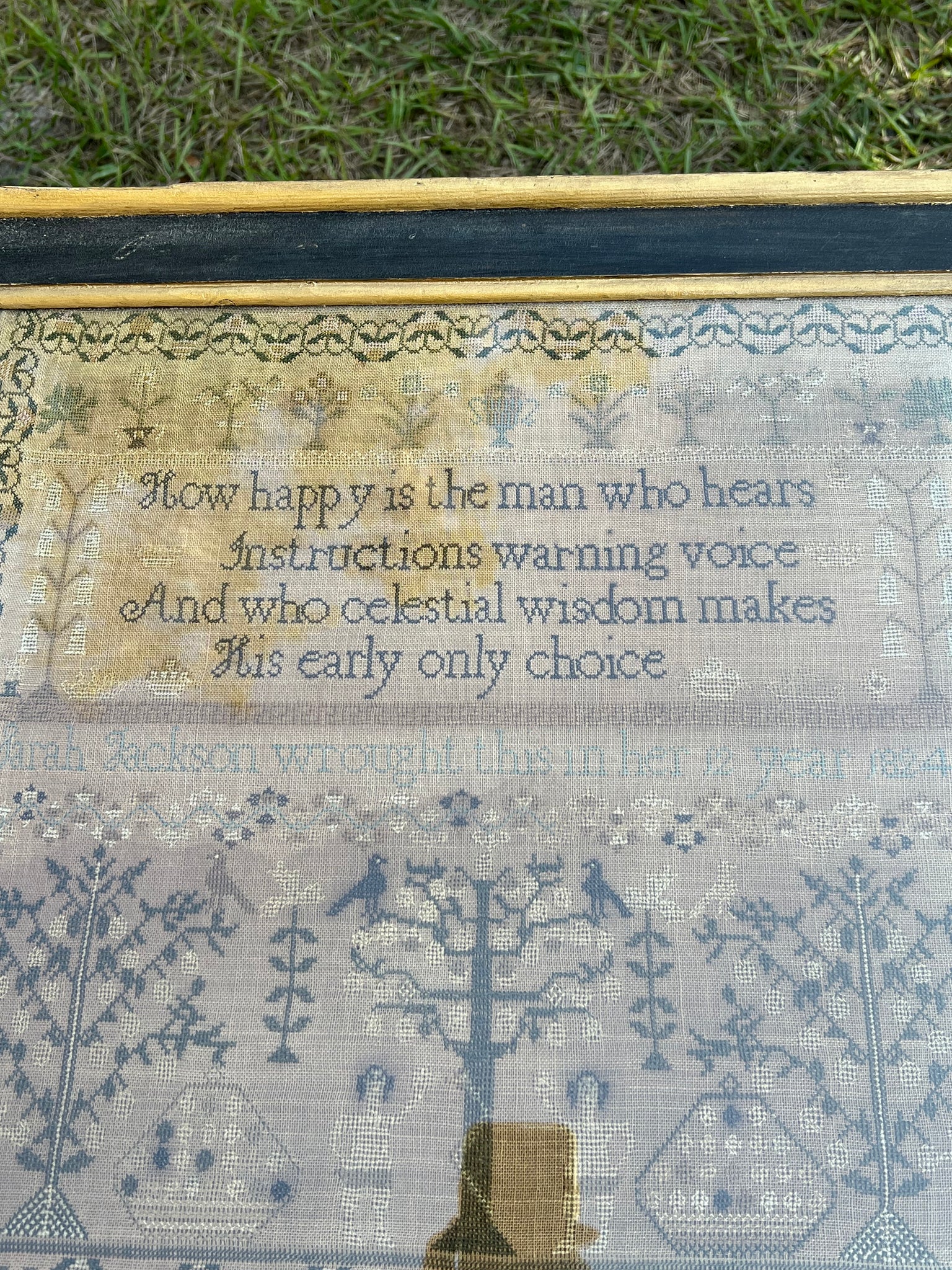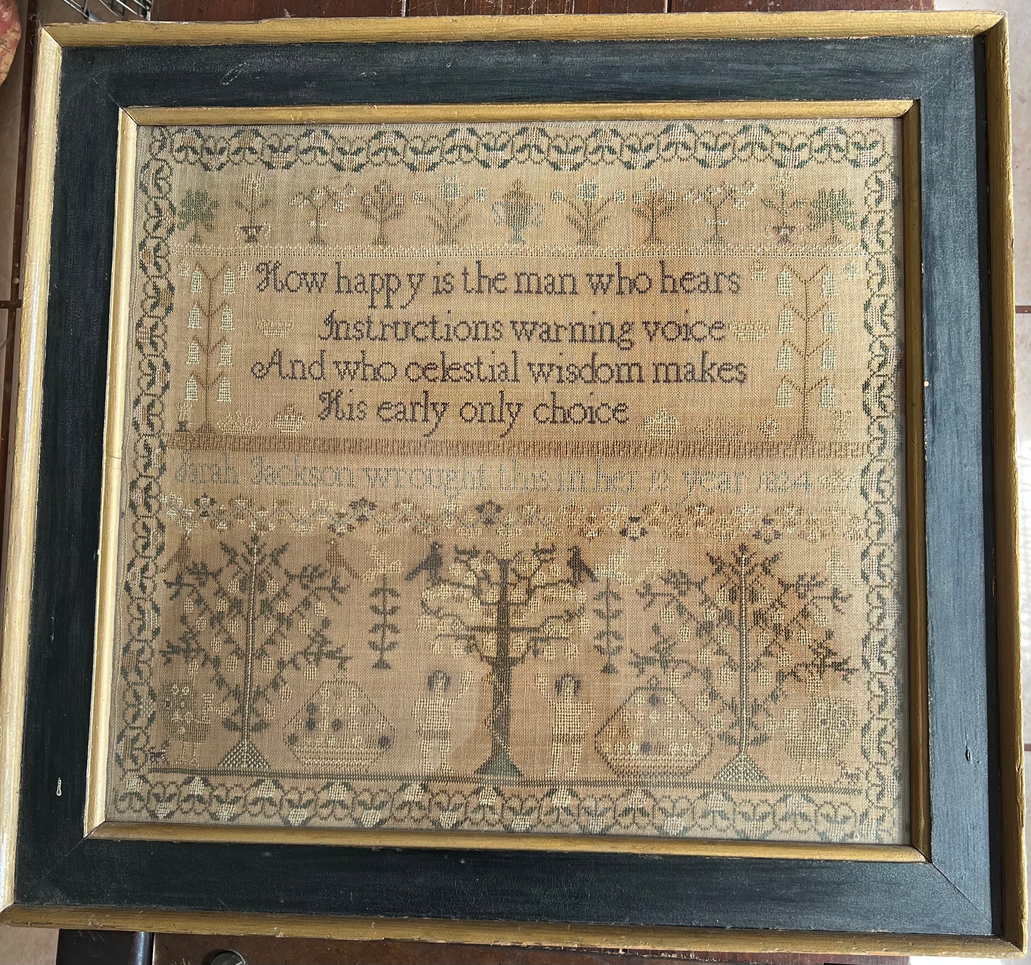| The Antique English Needlework Sampler by Sarah Jackson, aged 12 in 1824, is a beautifully crafted piece that showcases intricate multicolor embroidery. Made in the early 19th century, this sampler is a unique collectible item that reflects the skill and craftsmanship of that time period. Perfect for collectors of vintage linens and textiles, this piece is a beautiful representation of antique English needlework. The sampler measures 18.5” x 17.5” sight, 23.5” x 21.5” framed. The central figures are Adam and Eve with fruit baskets and peacocks to either side. It has not been reproduced. |