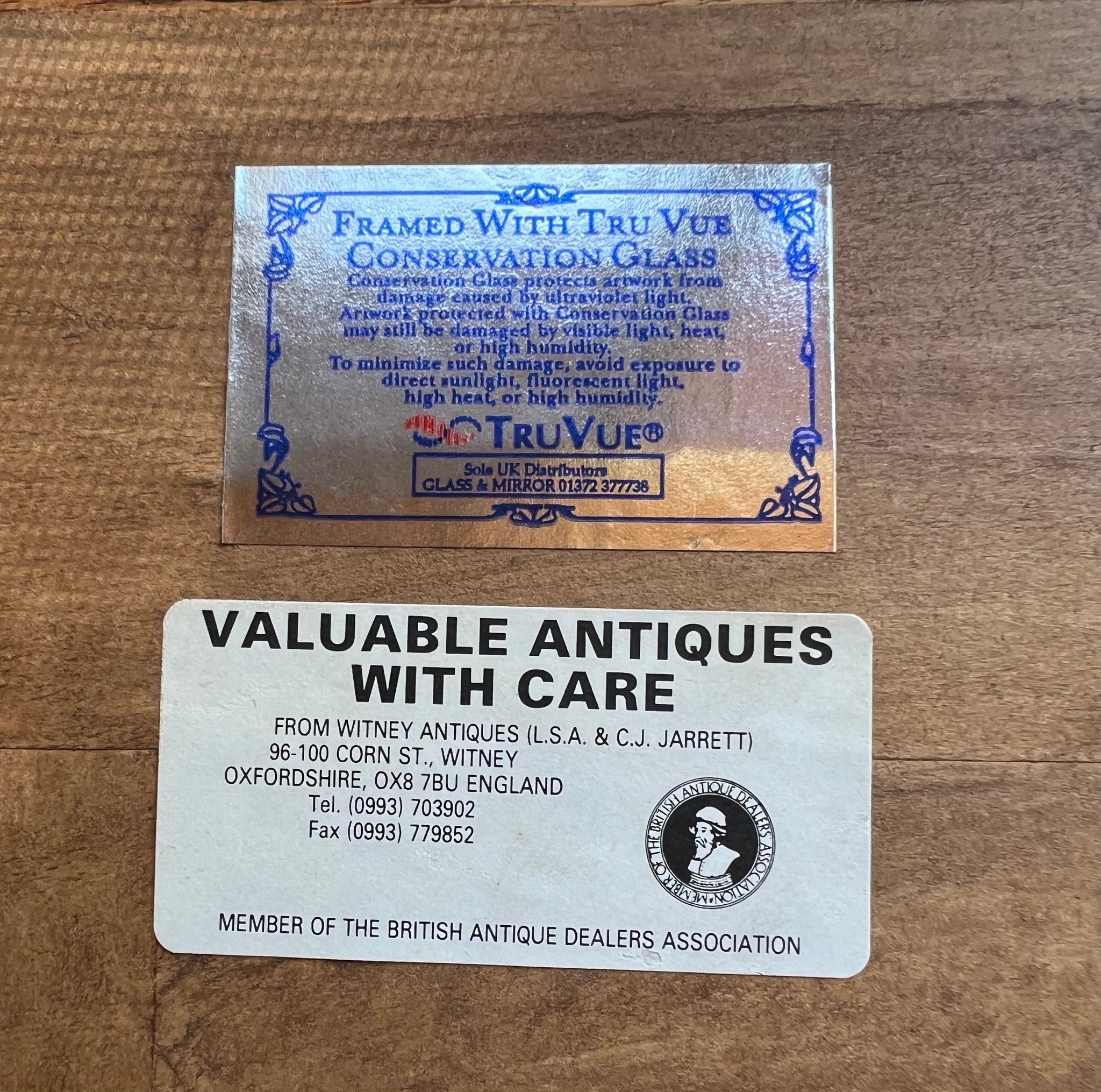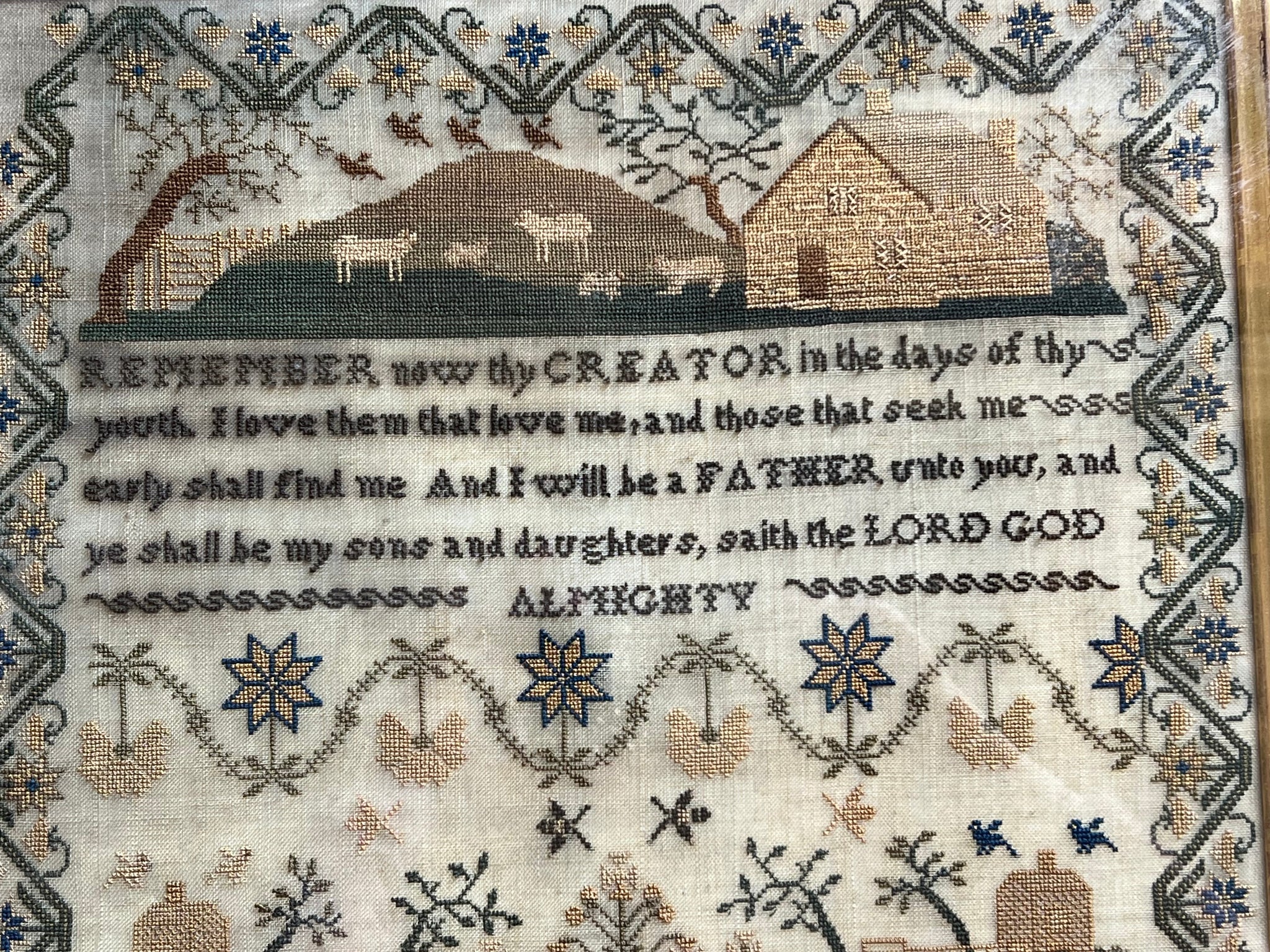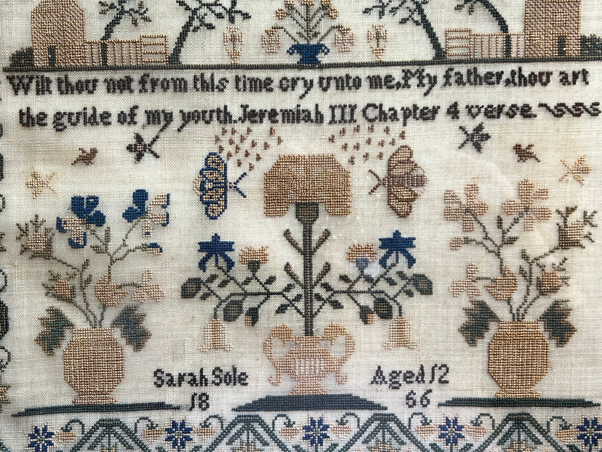 | The Antique English Needlework Sampler depicting Sarah Sole aged 12 in 1856 is a colorful and intricate piece of stitching that reflects the craftsmanship of the mid 19th century era. This sampler showcases a variety of needlework techniques and patterns, highlighting the skill and attention to detail of the English embroidery tradition during that time period. The multicolor design adds a vibrant and personalized touch to this historical piece of textile art. From the Whitney Antiques collection (see label). Measures 13” x 17.5” framed, 18.5” x 23” framed in Birds Eye maple frame. Has not been reproduced. |