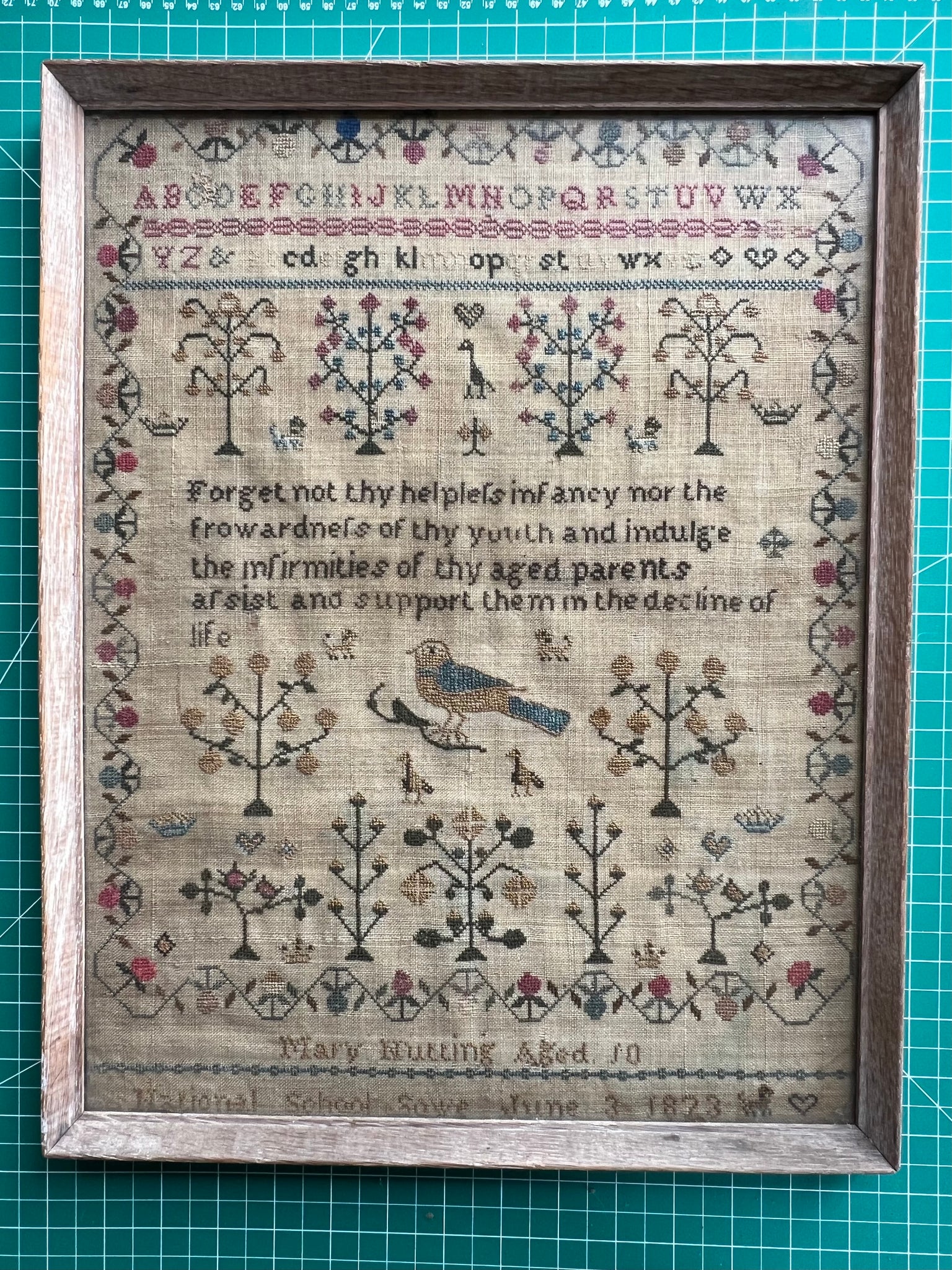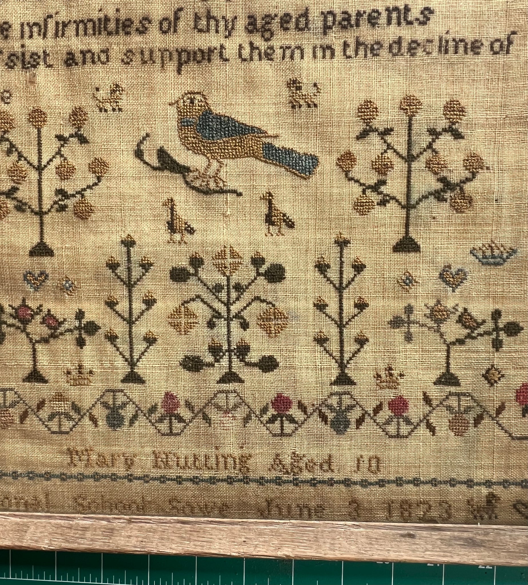 The Antique Needlework Sampler by Mary Nutting, aged 10, from June 3, 1823, is a beautifully crafted piece of embroidery with a multicolor design. This sampler showcases intricate stitching and attention to detail, reflecting the high level of skill and craftsmanship of the time period. Perfect for collectors or enthusiasts of historical textile art, this piece embodies the elegant and intricate artistry of needlework from the early 19th century.